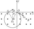 带正电粒子射入磁场后,由于受到洛伦兹力的作用,粒子将沿图11-35示的轨迹运动,从A点射出磁场,O、A间的距离为L,射出时速度的大小仍为v0,射出方向与x轴的夹角仍为θ.由洛伦兹力公式和牛顿定律可得