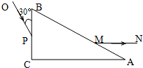 5、简答题 如图所示,ABC为直角三棱镜,BC边长为16cm,AB边长为32cm.有一束很强的细光束OP射到BC边上,入射点P为BC的中点,OP与BC的夹角为30°,该光束从P点进入棱镜后再经AC面反射沿与AC平行的MN方向射出,其中M为AC边上的一点,AM=8cm.则棱镜的折射率是多少?