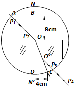 4、填空题 某同学由于没有量角器,在完成了光路图以后,以O点为圆心,10.00cm长为半径画圆,分别交线段OA于A点,交O、O′连线延长线于C点,过A点作法线NN′的垂线AB交于B点,过C点作法线NN′的垂线CD交NN′于D,如图所示,用刻度尺量得OB=8.00cm,CD=4.00cm.由此可得出玻璃的折射率为______.