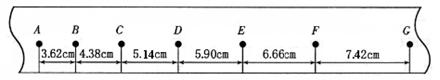 1、实验题 (8分)某同学在“探究小车速度随时间变化的规律”的实验中,用打点计时器记录了被小车拖动的纸带的运动情况,在纸带上确定的A、B、C、D、E、F、G共7个计数点,其相邻点间的距离如图所示,每两个相邻计数点之间还有四个点未画出。试根据纸带上各个计数点间的距离,求:(本题计算结果数值保留两位有效数字)