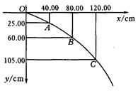 3、实验题 某同学通过实验对平抛运动进行研究,他在竖直墙上记录了抛物线轨迹的一部分,如图所示.O点不是抛出点,x轴沿水平方向,由图中所给的数据可求出平抛物体的初速度是?m/s,抛出点的坐标x=?m, y=?m (g取10m/s2)