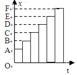 4、实验题 在打点计时器打下的纸带上,每5个点取1个测量点,共取了七个点,分别记为1、2、3、4、5、6、7,在测量点处剪断,按剪断次序把六段纸条编号为A、B、C、D、E、F,从A开始把纸条依次并排粘贴在白纸上,使纸条下端对齐,粘贴成直方图(如图x-t所示)。A、B、C、D、E、F的纸条长度分别为1.6cm,1.8cm,2.0cm,2.2cm,2.4cm,2.6cm,计时器打点频率为50Hz。则从打第1点到打第7点共历时________s,打第4点时的速度是_______m/s,纸带运动的加速度_________m/s2。