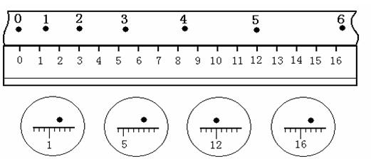 1、实验题 在“探究小车速度随时间变化的规律”的实验中,电火花打点计时器使用的交流电频率为50Hz,记录小车运动的纸带如图所示,在纸带上选择标为0---6的计数点,相邻两个计数点间还有四个计时点未画出,纸带旁边并排放着毫米刻度尺,零刻度点跟0计数点对齐,请你根据放大的图片按要求完成以下问题。