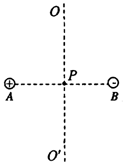 5、选择题 如图所示,A、B是两个带电量相等的异种点电荷,A带正电,B带负电,OO′为两点电荷连线的垂直平分线,P点是垂足,若从P点以大小为v0的初速度发射一个质子,则