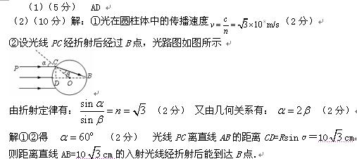 (2)图示是一透明的圆柱体的横截面,其半径R=20cm,折射率为,AB是一条直径,今有一束平行光沿AB方向射向圆柱体,试求: