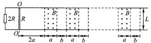 2、计算题  如图所示,两根相距为L的金属轨道固定于水平面上,导轨电阻不计;一根质量为m、长为L、电阻为R 的金属棒两端放于导轨上,导轨与金属棒间的动摩擦因数为μ,金属棒与导轨的接触电阻不计。导轨左端连有阻值为2R的电阻。轨道平面上有n段方向垂直轨道平面向外的宽度为a、间距为b的匀强磁场(a>b),磁感应强度为B。金属棒初始位于OO"处,与第一段磁场相距2a。求: