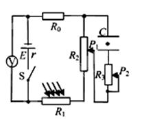 1、选择题 如右图所示,电源电动势为E,内阻为r。电路中的R2、R3分别为总阻值一定的滑动变阻器,R0为定值电阻,R1为光敏电阻(其电阻随光照强度增大而减小)。当电键S闭合时,电容器中一带电微粒恰好处于静止状态。有关下列说法中正确的是( )