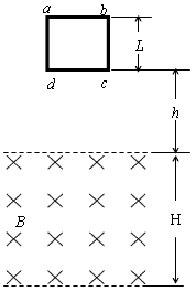 5、计算题 如图所示,质量为m,边长为L的正方形线框abcd,从垂直纸面向里的水平有界匀强磁场的上方h高度处由静止自由下落,磁场高度为H,线框下落过程中始终在同一竖直平面内且cd边与磁场边界都沿水平方向。