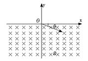 3、计算题 (10分)如图所示,在y<0的区域内存在匀强磁场,磁场方向垂直于xy平面并指向纸里,磁感应强度为B。一带负电的粒子(质量为m、电荷量为q)以速度v0从O点射入磁场,入射方向在xy平面内,与x轴正向的夹角为θ。(粒子所受重力不计)求:
