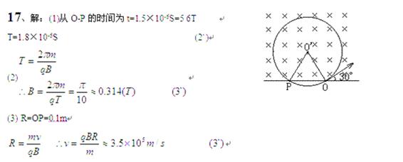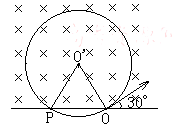 5、计算题 如图所示,一带电量为2.0×10=9C , 质量为1.8×10 –16Kg的粒子,在直线上一点O沿30o角方向进入磁感应强度为B的匀强磁场中,经历1.5×10- 6s后到达直线上另一点P.(重力不计)求: