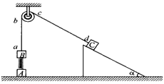 2、计算题 如图所示,在竖直方向上A、B两物体通过劲度系数为k的轻质弹簧相连,A放在水平地面上;B、C两物体通过细绳绕过轻质定滑轮相连,C放在固定的光滑斜面上。用手拿住C,使细线刚刚拉直但无拉力作用,并保证ab段的细线竖直、cd段的细线与斜面平行。已知A、B的质量均为m,C的质量为4m,重力加速度为g,细线与滑轮之间的摩擦不计,开始时整个系统处于静止状态。释放C后它沿斜面下滑,A刚离开地面时,B获得最大速度,求: