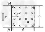 2、计算题 如图所示,光滑的平行金属导轨水平放置,电阻不计,导轨间距为L=1 m,左侧接一阻值为R=0.3 Ω的电阻,区域efgh内存在垂直轨道平面向下的有界匀强磁场,磁感应强度为B=0.5 T,磁场的宽度为d=1 m;一质量为m=1 kg、电阻为r=0.2 Ω的金属棒MN置于导轨上,与导轨垂