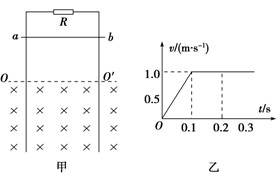 5、计算题 如图甲所示,不计电阻的平行金属导轨竖直放置,导轨间距为L=1 m,上端接有电阻R=3 Ω,虚线OO′下方是垂直于导轨平面的匀强磁场,现将质量m=0.1 kg、电阻r=1 Ω的金属杆ab,从OO′上方某处垂直导轨由静止释放,杆下落过程中始终与导轨保持良好接触,杆下落过程中的v-t图象如图乙所示(取g=10 m/s2).求: