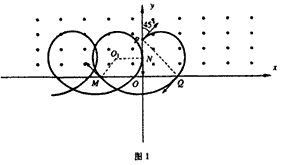 设粒子第一次、第二次通过x轴上的点为分别为Q、M,粒子在y>0和y<0区域作圆周运动的半径分别为R0和R1,通过y轴上的点为N,y<0区域的磁感应强度大小为B1