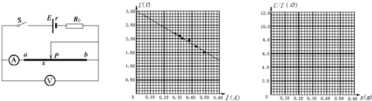 3、填空题 某同学为测定某电源的电动势E和内阻r,设计了如图所示的电路.ab是一段电阻率较大的粗细均匀的电阻丝,R0是阻值为2Ω的保护电阻,滑动片P与电阻丝接触始终良好.实验时闭合电键,调节P的位置,将aP长度x和对应的电压U、电流I数据记录如表: