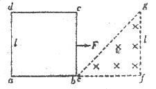 2、选择题 在光滑水平桌面上有一边长为l的正方形线框abcd, bc边右侧有一等腰直角三角形匀强磁场区域efg,三角形腰长为l,磁感应强度垂直桌面向下,abef在同一直线上,其俯视图如图所示,线框从图示位置在水平拉力F作用下向右匀速穿过磁场区,线框中感应电流i及拉力F随时间t的变化关系可能是(以逆时针方向为电流的正方向,时间单位为l/v)