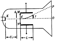 4、计算题 如图所示为一真空示波管的示意图,电子从灯丝K发出(初速度可忽略不计),经灯丝与A板间的电压U1加速,从A板中心孔沿中心线KO射出,然后进入两块平行金属板M、N形成的偏转电场中(偏转电场可视为匀强电场),电子进入M、N间电场时的速度与电场方向垂直,电子经过电场后打在荧光屏上的P 点。已知M、N两板间的电压为U2,两板间的距离为d,板长为L,电子的质量为m,电荷量为e,不计电子受到的重力及它们之间的相互作用力。
