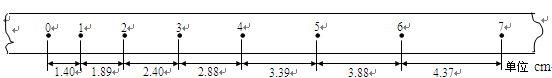 4、实验题 下图给出的是实验中获取的一条纸带的一部分:0、1、2、3、4、5、6、7是计数点,每相邻两计数点间还有4个打点(图中未标出),计数点间的距离如图所示.根据图中数据计算第6点速度V= m/s,滑块的加速度a= m/s2(保留三位有效数字).