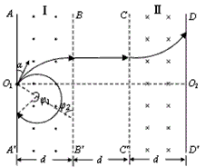 参考答案:解:(1)若粒子的速度小于某一值v0时,则粒子不能从BB′离开区域Ⅰ,只能从AA′边离开区域Ⅰ,无论粒子速度大小,在区域Ⅰ中运动的时间相同,轨迹如图所示(图中只画了一个粒子的轨迹)