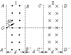 4、计算题 如图所示,条形区域Ⅰ和Ⅱ内分别存在方向垂直于纸面向外和向里的匀强磁场,磁感应强度B的大小均为0.3T,AA′、BB′、CC′、DD′为磁场边界,它们相互平行,条形区域的长度足够长,磁场宽度及BB′、CC′之间的距离d=1m。一束带正电的某种粒子从AA′上的O点以沿与AA′成60°角、大小不同的速度射入磁场,当粒子的速度小于某一值v0时,粒子在区域Ⅰ内的运动时间t0=4×10-6s;当粒子速度为v1时,刚好垂直边界BB′射出区域Ⅰ。取π≈3,不计粒子所受重力。 求: