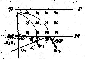 5、计算题 如右图所示,有界匀强磁场边界线SP//MN,速率不同的同种带电粒子(重力不计)从S 点沿SP方向同时射入磁场。其中穿过a点的粒子速度v1与MN垂直,穿过b点的粒子速度v2与MN成60°角,设两粒子从S到a、b所需时间分别为t1和t2。