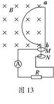5、计算题 (17分)如图所示,一个半径为r的半圆形线圈,以直径ab为轴匀速转动,转速为n,ab的左侧有垂直于纸面向里(与ab垂直)的匀强磁场,磁感应强度为B.M和N是两个集流环,负载电阻为R,线圈、电流表和连接导线的电阻不计,求: