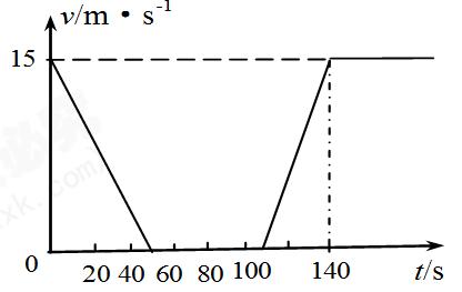 3、计算题 列车以54Km/h的速度在某段平直的铁路上匀速前进,现需在某站临时停车,如果在此站停留的时间是1min,列车进站时的加速度大小为0.3m/s2,出站时的加速度大小为0.5m/s2。