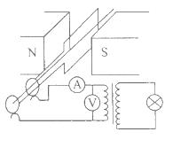 4、选择题 某兴趣小组用实验室的手摇发电机和理想变压器给一个灯泡供电,电路如图所示。当线圈以较大的转速n匀速转动时,电压表示数是U1,额定电压为U2的灯泡正常发光,灯泡正常发光时电功率为P,手摇发电机的线圈电阻是r,则有