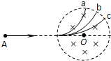 4、选择题 如图所示,圆形区域内有垂直纸面向内的匀强磁场,三个质量和电荷量都相同的带电粒子a、b、c,以不同的速率对准圆心O沿着AO方向射入磁场,其运动轨迹如图.若带电粒子只受磁场力的作用,则下列说法错误的是( )