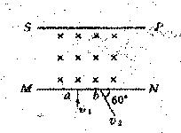 1、计算题 如右图所示,有界匀强磁场边界线SP//MN,速率不同的同种带电粒子(重力不计)从S 点沿SP方向同时射入磁场。其中穿过a点的粒子速度v1与MN垂直,穿过b点的粒子速度v2与MN成60°角,设两粒子从S到a、b所需时间分别为t1和t2。