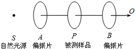 2、选择题 2008年,“假奶粉事件”闹得沸沸扬扬,奶粉的碳水化合物(糖)含量是一种重要指标,可以用“旋光法”来测量糖溶液的浓度,从而测定含糖量,偏振光通过糖的水溶液后,偏振方向会相对于传播方向向左或向右旋转一个角度α,这一角度α称为“旋光度”,α的值只与糖溶液的浓度有关,将α的测量值与标准值相比较,就能测量被测样品的含糖量了.如图,S是自然光源,A、B是偏振片,转动B,使到达O处的光最强,然后将被测样品P置于A、B之间,则下列说法中正确的是( ? )