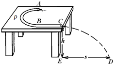 3、计算题 如图所示,用内壁光滑的薄壁细圆管弯成的由半圆形APB(圆半径比细管的内径大得多)和直线BC组成的轨道固定在水平桌面上,已知APB部分的半径R=1.0 m,BC段长L=1.5m。弹射装置将一个小球(可视为质点)以v0=5m/s的水平初速度从A点弹入轨道,小球从C点离开轨道随即水平抛出,落地点D离开C的水平距离s=2m,不计空气阻力,g取10m/s2。求: