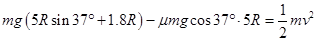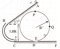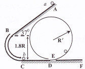 4、计算题 如图所示,倾斜轨道AB的倾角为37o,CD、EF轨道水平,AB与CD通过光滑圆弧管道BC连接,CD右端与竖直光滑圆周轨道相连。小球可以从D进入该轨道,沿轨道内侧运动,从E滑出该轨道进入EF水平轨道。a、b为两完全相同的小球,a球由静止从A点释放,在C处与b球发生弹性碰撞。已知AB长为5R,CD长为R,重力加速度为g,小球与斜轨AB及水平轨道CD、EF的动摩擦因数均为0.5,sin37o=0.6,cos37o=0.8,圆弧管道BC入口B与出口C的高度差为1.8R。求: