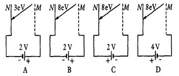 5、填空题 如图所示,N为钨板,M为金属网,它们分别与电池两极相连,各电池的电动势E和极性已在图中标出,钨的逸出功为4. 5 e V,现分别用能量不同的光子照射钨板(各光子的能量也已在图上标出),那么下列图中没有电子到达金属网的是
