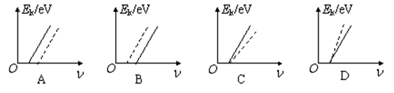3、选择题 不同频率的紫外光分别照射钨和锌的表面而产生光电效应,可得到光电子的最大初动能Ek随入射光频率v变化的Ek—v图象.已知钨的逸出功是3.28eV,锌的逸出功是3.34eV,若将二者的图线画在同一个坐标中,以实线表示钨、虚线表示锌,能正确反映这一过程的选项是