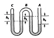 3、填空题 如图所示,竖直放置的弯曲管A端开口,C端封闭,密度为ρ的液体将B、C两段空气封闭在管内,管内液面高度差分别为h1、h2和h3,已知大气压强为p0,则B段气体的压强为 ,C段气体的压强为 。
