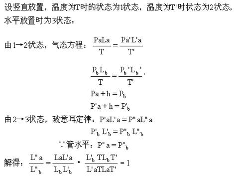1、简答题 在两端封闭、内径均匀的直玻璃管内,有一段水银柱将两种理想气体a和b隔开如图.将管竖直放置,达到平衡时,若温度为T时,气柱a和b分别为La和Lb,若温度为T时,长度分别为L"a和L"b,然后将管平放在水平桌面上,在平衡时,两段气柱长度分别为L"a和L"b.已知T、T"、La、L"a、Lb、L"b,求L"a/L"b.