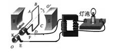 2、选择题 如图所示,50匝矩形线圈ABCD处于水平匀强磁场中,电阻不计。线框绕垂直于磁场的轴OO′匀速转动,线圈中产生的感应电流通过金属滑环E、F与理想变压器原线圈相连,变压器的副线圈线接入一只“220V,60W”灯泡,且灯泡正常发光,下列说法正确的是( )