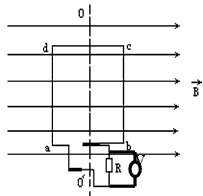 1、计算题 如图所示,矩形线圈abcd在磁感强度B=2T的匀强磁场中绕轴OO′,以角速度ω=10πrad/s匀速转动,线圈匝数N=10,总电阻为r=1Ω。ab=0.2m,bc=0.3m,负载电阻R=14Ω。求: