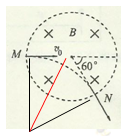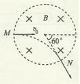 5、选择题 如图所示,在半径为R的圆柱形区域内有匀强磁场。一个电子以速度为v0从M点沿半径方向射入该磁场,从N点射出,速度方向 偏转了