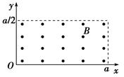 范围内垂直于xOy平面向外的匀强磁场,磁感应强度大小为B.坐标原点O处有一个粒子源,在某时刻发射大量质量为m、电荷量为q的带正电粒子,它们的速度大小相同,速度方向均在xOy平面内,与y轴正方向的夹角分布在0~90°范围内.已知粒子在磁场中做圆周运动的半径介于a/2到a之间,从发射粒子到粒子全部离开磁场经历的时间恰好为粒子在磁场中做圆周运动周期的四分之一.求最后离开磁场的粒子从粒子源射出时的