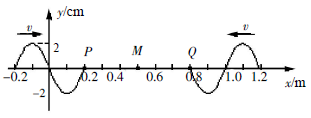 4、选择题 (5分)如图所示,两列简谐横波分别沿x轴正方向和负方向传播,两波源分别位于x=-0.2m和x=1.2m处,两列波的速度均为v=0.4 m/s,两波源的振幅均为A="2" cm。图示为 t=0时刻两列波的图像(传播方向如图所示),此刻平衡位置处于x=0.2m和x=0.8m的P、Q两质点刚开始振动。质点M的平衡位置处于x=0.5m处,关于各质点运动情况判断正确的是: