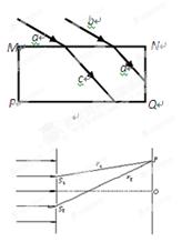3、选择题 一矩形玻璃砖放置在空气中,如图所示,两束相同的平行单色光a、b照射到矩形玻璃砖的上表面,折射后分别照射到PQ和NQ界面上,下列说法中正确的是?