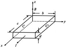 2、计算题 一块N型半导体薄片(称霍尔元件),其横载面为矩形,体积为b×c×d,如图所示。已知其单位体积内的电子数为n、电阻率为ρ、电子电荷量e,将此元件放在匀强磁场中,磁场方向沿z轴方向,并通有沿x轴方向的电流I。