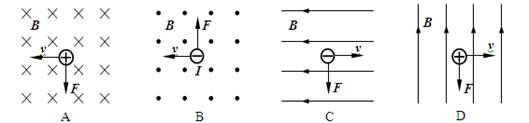 1、选择题 关于电荷在磁场中运动速度、磁场和电荷受到洛仑兹力三者之间的方向关系如图所示,其中正确的是(?)