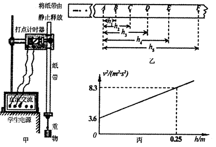 ②该同学经正确操作得到如图乙所示的纸带,取连续的六个点,测得h1、h2、h3、h4、h5.若打点的周期为T,则打E点时速度为vE =___________;若分别计算出各计数点对应的速度数值,并在坐标系中画出v2与h的关系图线,如图丙所示,则重力加速度g=_________m/s2.