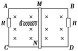 3、选择题 如右图所示,AB、CD为两个平行的、不计电阻的水平光滑金属导轨,处在方向竖直向下,磁感应强度为B的匀强磁场中.AB、CD的间距为L,左右两端均接有阻值为R的电阻.质量为m长为L且不计电阻的导体棒MN放在导轨上,与导轨接触良好,并与轻质弹簧组成弹簧振动系统.开始时,弹簧处于自然长度,导体棒MN具有水平向左的初速度v0,经过一段时间,导体棒MN第一次运动到最右端,这一过程中AC间的电阻R上产生的焦耳热为Q,则( )