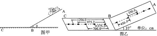 2、填空题 (6分)某学生骑着自行车(可视为质点)从倾角为θ=37°的斜坡AB上滑下,然后在水平地面BC上滑行一段距离后停下,整个过程中该学生始终未蹬脚踏板,如图甲所示.自行车后架上固定一个装有墨水的容器,该容器距地面很近,每隔相等时间T滴下一滴墨水.该学生用最小刻度为cm的卷尺测得某次滑行数据如图乙所示.假定人与车这一整体在斜坡上和水平地面上运动时所受的阻力大小相等.己知人和自行车总质量m=80kg,g取10m/s2,sin37°=0.6,cos37°=0.8.则T=__________s,人与车在斜坡AB上运动时加速度大小a1=__________m/s2,在水平地面
