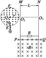 2、计算题 (17分)如图所示,半径为r、圆心为O1的虚线所围的圆形区域内存在垂直纸面向外的匀强磁场,在磁场右侧有一竖直放置的平行金属板M和N,两板间距离为L,在MN板中央各有一个小孔O2、O3,O1、O2、O3在同一水平直线上,与平行金属板相接的是两条竖直放置间距为L的足够长的光滑金属导轨,导体棒PQ与导轨接触良好,与阻值为R的电阻形成闭合回路(导轨与导体棒的电阻不计),该回路处在磁感应强度大小为B,方向垂直纸面向里的匀强磁场中,整个装置处在真空室中,有一束电荷量为+q、质量为m的粒子流(重力不计),以速率v0从圆形磁场边界上的最低点E沿半径方向射入圆形磁场区域,最后从小孔O3射出.现释放导体棒PQ,其下滑h后开始匀速运动,此后粒子恰好不能从O3射出,而从圆形磁场的最高点F射出.求: