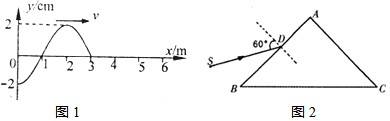 (3)如图2所示,一等腰直角三棱镜,放在真空中,AB=AC.在棱镜侧面AB左方有一单色光源S,从S发出的光线SD以60°入射角从AB侧面中点射入三棱镜,当它从侧面AC射出时,出射光线与棱镜侧面AC间的夹角为30°.求此三棱镜的折射率.